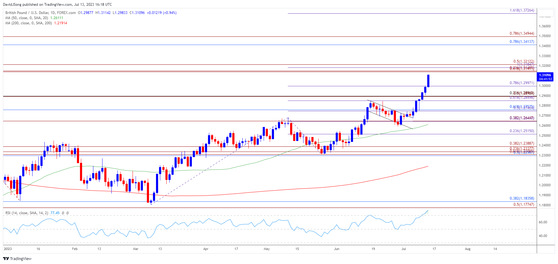 • 随着英镑/美元突破6月高点(1.2848),看涨旗形逐渐成形,汇率上涨在2023年首次将相对强弱指数(RSI)推向超买区域。